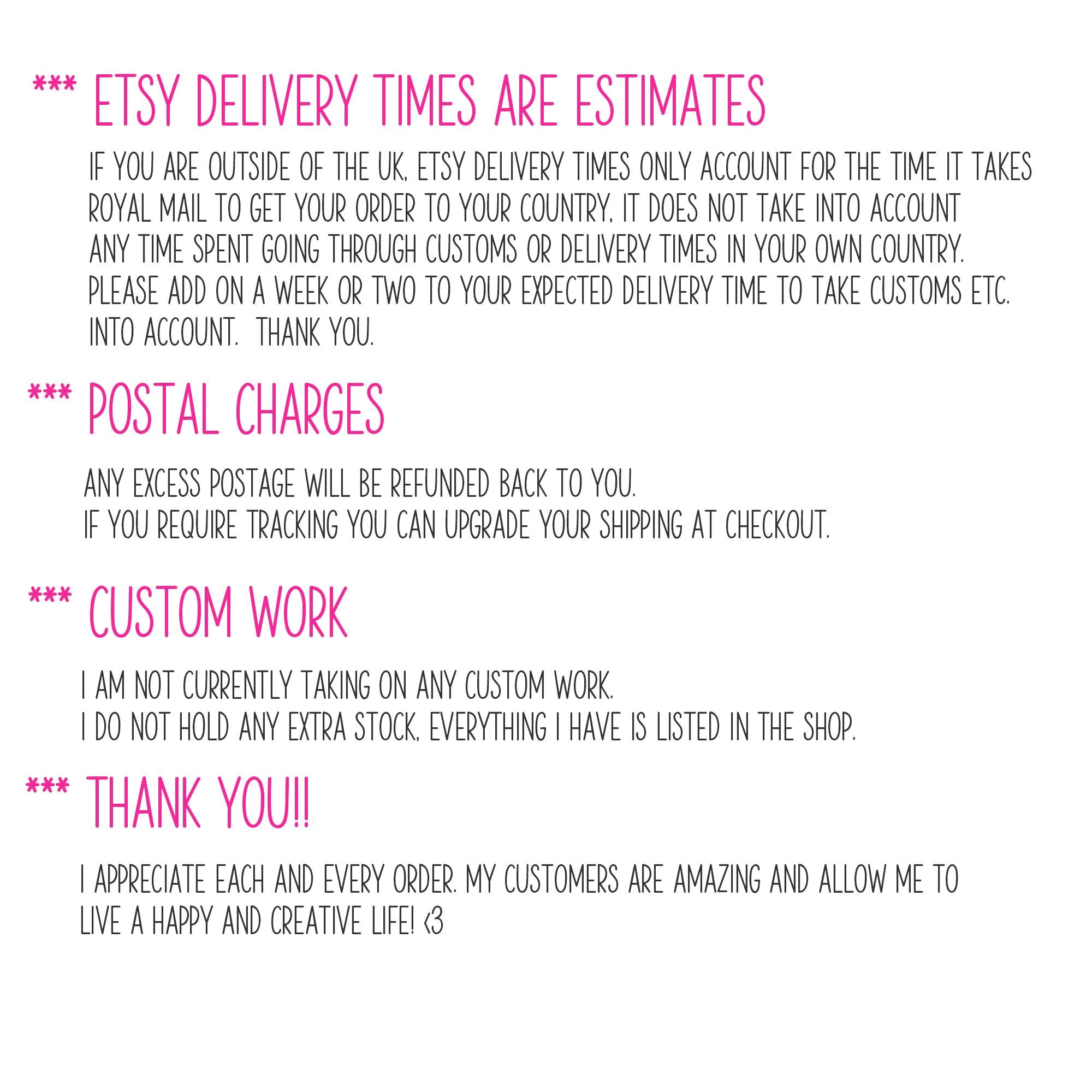 I am shipping to the USA as normal. The 10% tariff is pre-paid via Royal Mail (who remit it to the US government) and US customers will NOT incur any further charges upon delivery. Orders are dispatched within 1-7 days. Delivery estimates given by Etsy do not take into account time taken to process through customs for international orders. Please see second pic for more info on delivery times. Thanks!